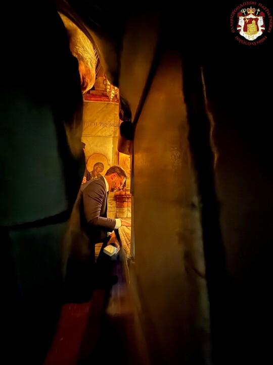 Ο Πατριάρχης Θεόφιλος προσωπικά ξενάγησε τον αντιπρόεδρο και τη σύζυγό του στα ιερά μέρη του ναού, αναφέροντας τη βαθιά σημασία του για ολόκληρο τον χριστιανικό κόσμο ως τόπο της Σταύρωσης και της Ανάστασης του Κυρίου.
