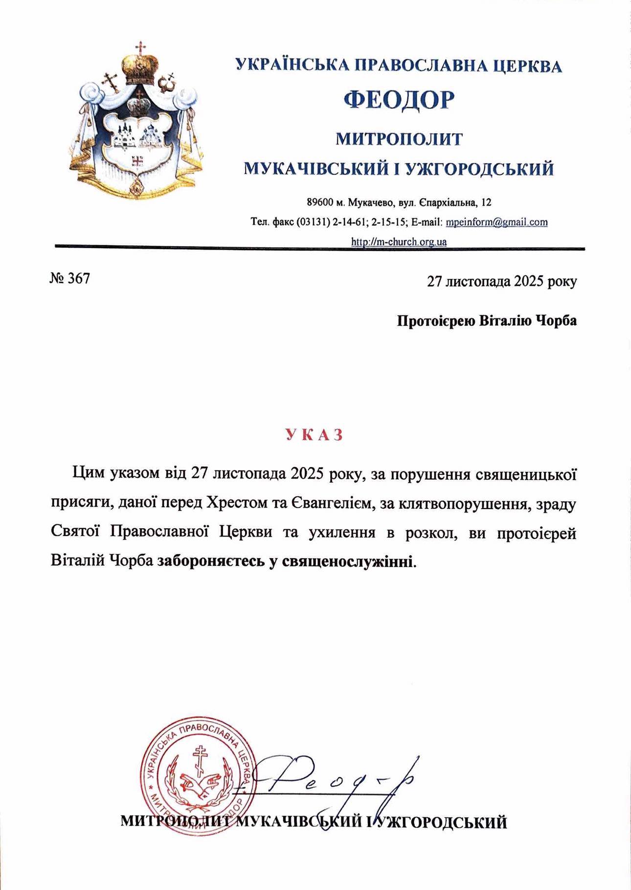 Ο Μητροπολίτης Μουκάτσεβο και Ουζγκορόντ Θεόδωρος με το διάταγμά του από τις 27 Νοεμβρίου 2025 απαγόρευσε την ιερατική υπηρεσία του πρωτοπρεσβύτερου Ουκρανικής Ορθόδοξης Εκκλησίας (УПЦ) Βιτάλιου Τσόρμπου. Αυτό αναφέρει το γραφείο τύπου της Μητρόπολης Μουκάτσεβο.