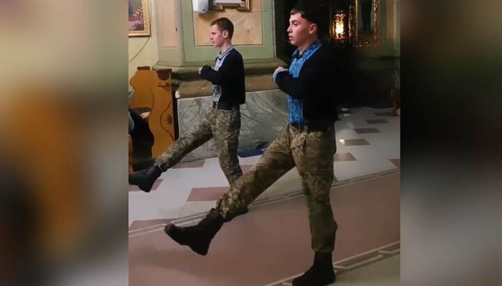 Στο βίντεο στον ναό της UGCC παιδιά με παραδοσιακές ουκρανικές κεντητές μπλούζες και παντελόνια pixel παρελαύνουν με στρατιωτικό βήμα μέσα στον ναό προς τον επιτάφιο και πίσω.