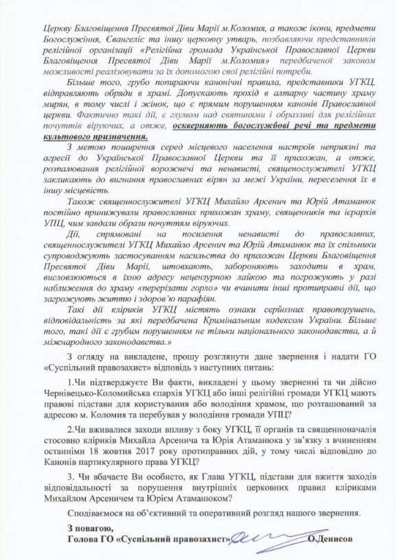 «Публичное разжигание ненависти и угрозы жизни и здоровью верующих УПЦ стало фактом, неоднократно подтвержденным средствами массовой информации. К сожалению, активистами захвата храма и лицами, непосредственно угрожающими верующим, являются клирики Украинской греко-католической церкви», – сообщают правозащитники.