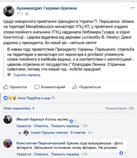 Архимандрит Гавриил Кризина так комментирует ролик на своей странице в Facebook: «По поводу новогоднего поздравления президента Украины П. Порошенко: съемки на территории Михайловского монастыря УПЦ КП, в поздравлении упомянуто слова покойного главы УГКЦ кардинала Любомира Гузара; а согласно Конституции - Церковь отделена от государства («спасибо» В. Ленину). Странные советники у президента, потому что новый год – светский праздник!»