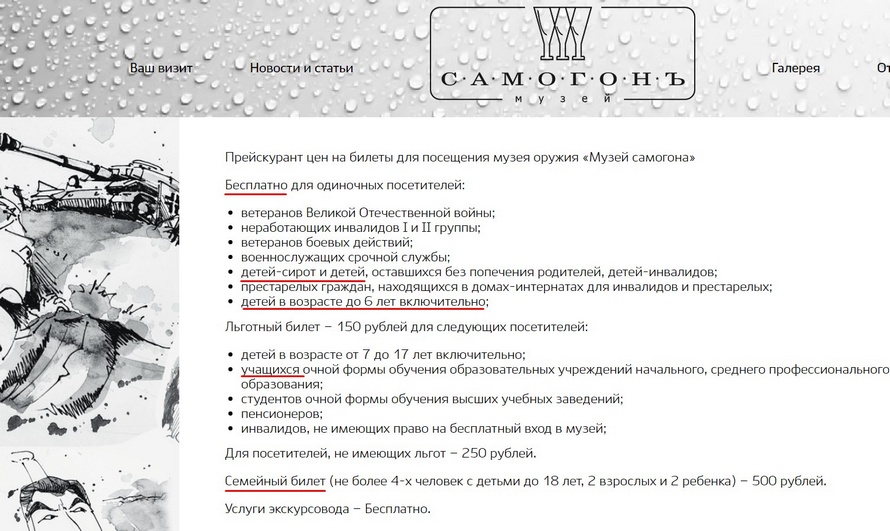 Не менее необычно выглядит и Прейскурант цен музея: посещение «бесплатно для детей-сирот и детей, оставшихся без попечения родителей, детей-инвалидов»; «детей в возрасте до 6 лет включительно». Льготный билет гарантирован детям от 7 до 17 лет включительно и для учащихся очной формы обучения образовательных учреждений. К искусству самогоноварения можно приобщиться и по Семейному билету (не более 4-х человек с детьми до 18 лет). Услуги экскурсовода – бесплатно. Музей откроется в конце февраля.