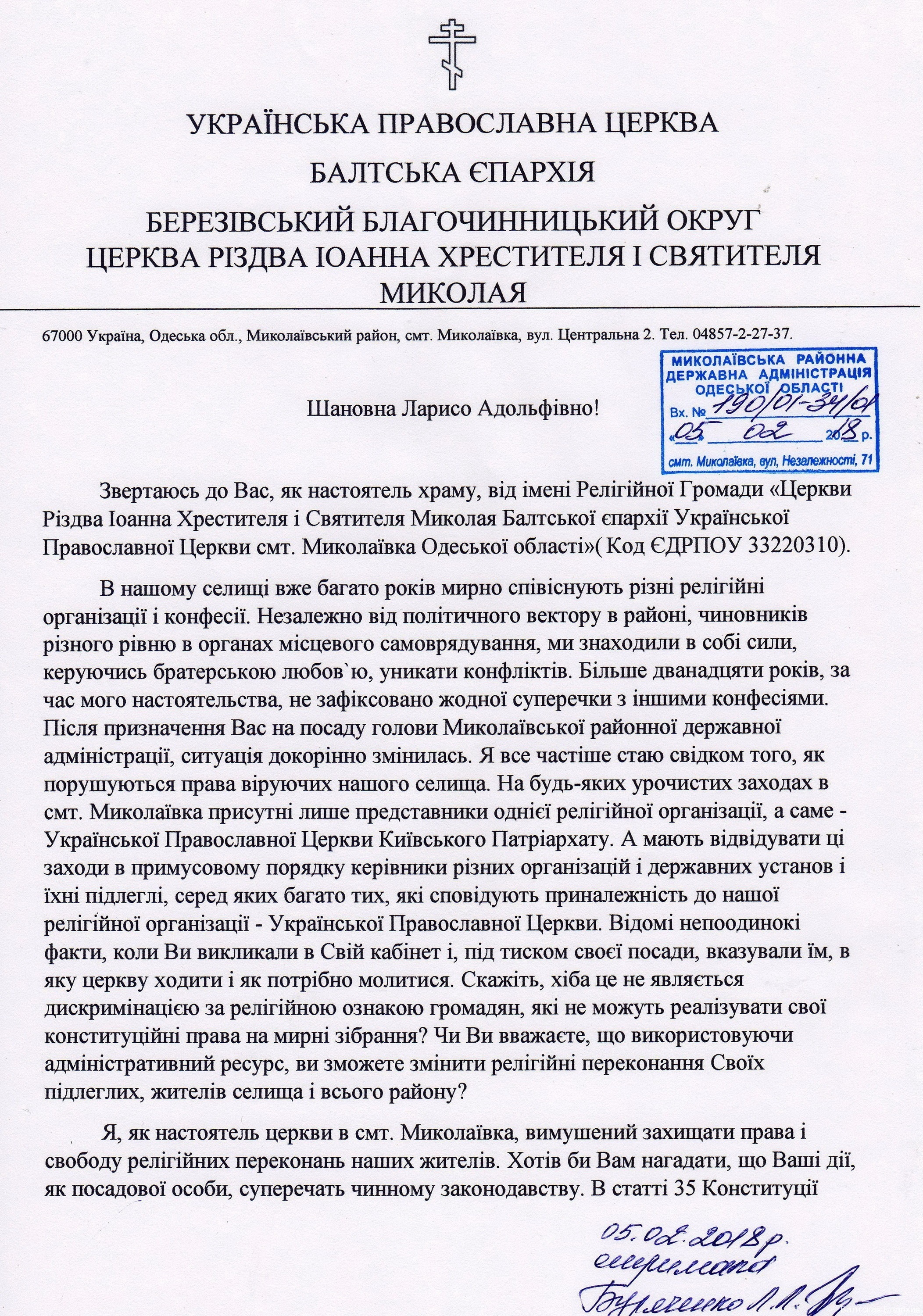«Я все чаще становлюсь свидетелем нарушений прав верующих нашего поселка. На торжественных мероприятиях в пгт Николаевка можно заметить присутствие лишь одной религиозной организации – Украинской Православной Церкви Киевского патриархата. Известны факты, когда Вы вызывали в свой кабинет и, под давлением своей должности, указывали, в какую церковь людям ходить и каким образом молиться», – пишет священнослужитель.
