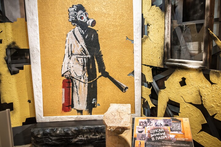 В Национальном заповеднике «Киево-Печерская лавра» выставили фрагмент стены с граффити Бэнкси — изображением женщины в халате с огнетушителем и бигудями. Музейщики сообщают, что экспонат размещен в Большой лаврской колокольне рядом с древнерусским граффити XI века, созданным одним из строителей Успенского собора.