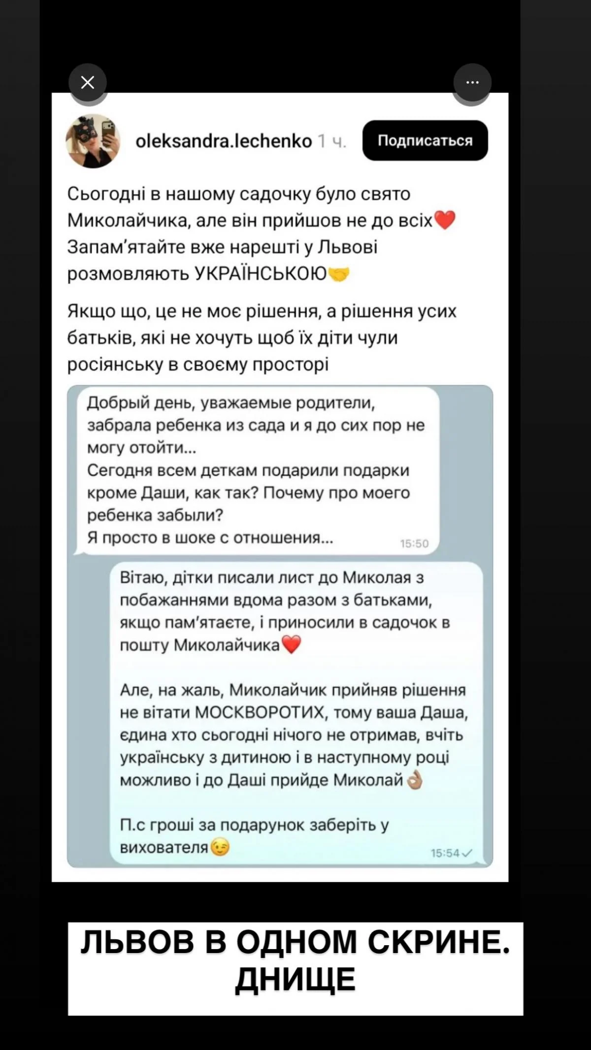 Во Львове разгорелся скандал в одном из детских садов. В социальных сетях распространяется скриншот переписки из родительского чата, в которой говорится что ребенка лишили подарка на «новостильного» Николая, потому что родители написали письмо святителю на русском языке. Скрины опубликовала блоггер Анна Алхим, сопровождая их возмущенными комментариями.