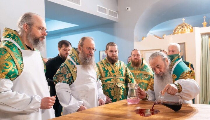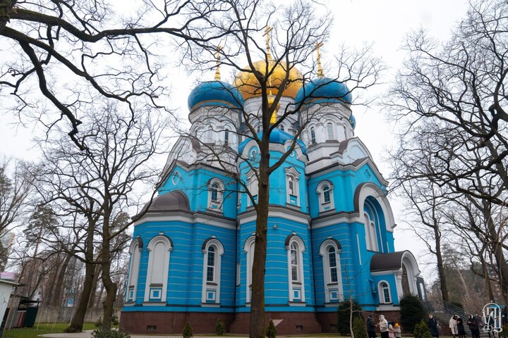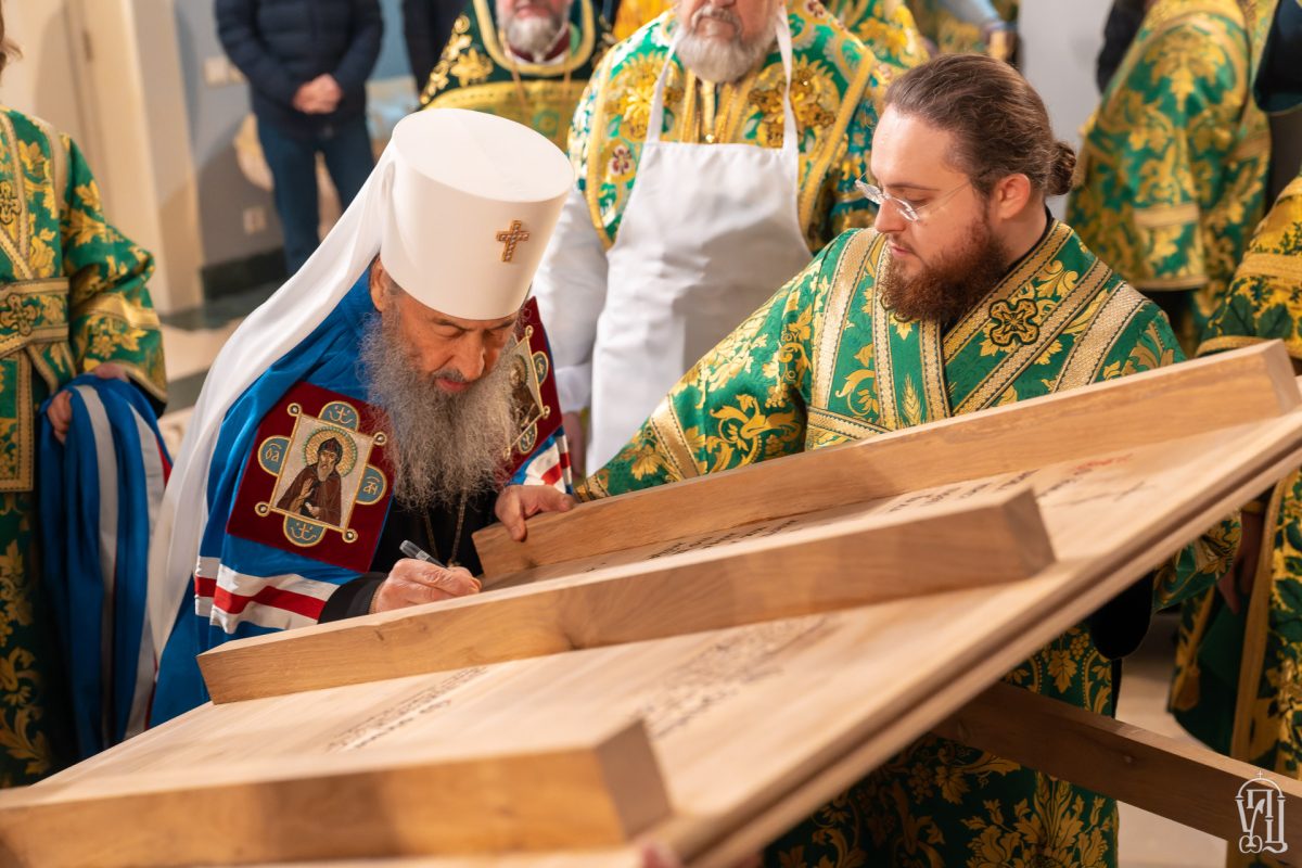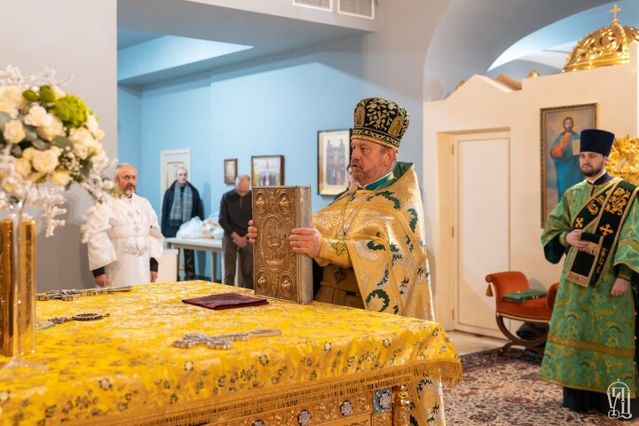 Освященный храм является нижним храмом в комплексе Благовещенского собора в районе Святошино. После совершения чина великого освящения Предстоятель возглавил в новоосвященном храме Божественную литургию.