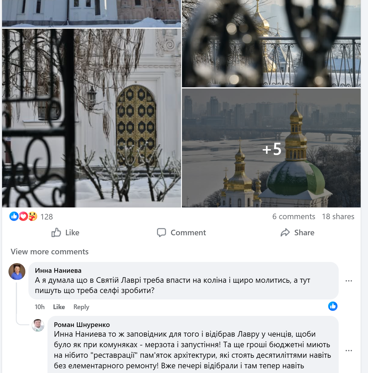 У киевлян этот пост вызвал недоумение. Инна Наниева написала в комментариях: «А я думала, что в Святой Лавре нужно пасть на колени и искренне молиться, а здесь пишут, что нужно селфи сделать?»