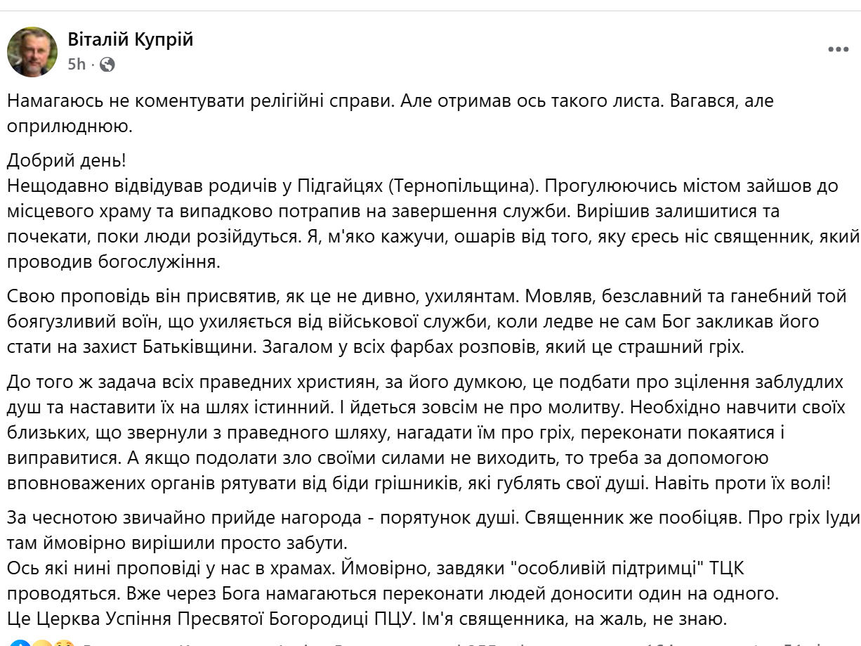 Украинский политик и правозащитник, ранее народный депутат блока Порошенко Виталий Куприй обнародовал в Facebook письмо, полученное от жителя Тернопольщины, который рассказал о проповеди в храме ПЦУ Успения Пресвятой Богородицы в Подгайцах.