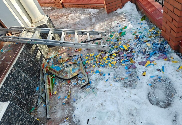 На опубликованных фотографиях видно рассыпанные осколки витража, выбитые окна и поврежденные двери. Здание часовни получило видимые разрушения как внутри, так и у входа.