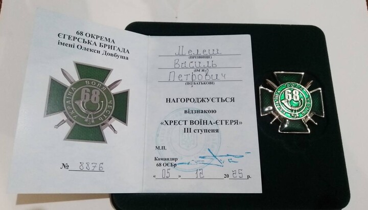 Священник Хустской епархии УПЦ, протоиерей Василий Мелеш, получил награду отличие «Крест воина-егеря» III степени 68-й отдельной егерской бригады имени Олексы Довбуша Сухопутных войск ВСУ. Награду вручили по приказу командира бригады подполковника Сергея Третьяка. Об этом сообщили в пресс-службе епархии.