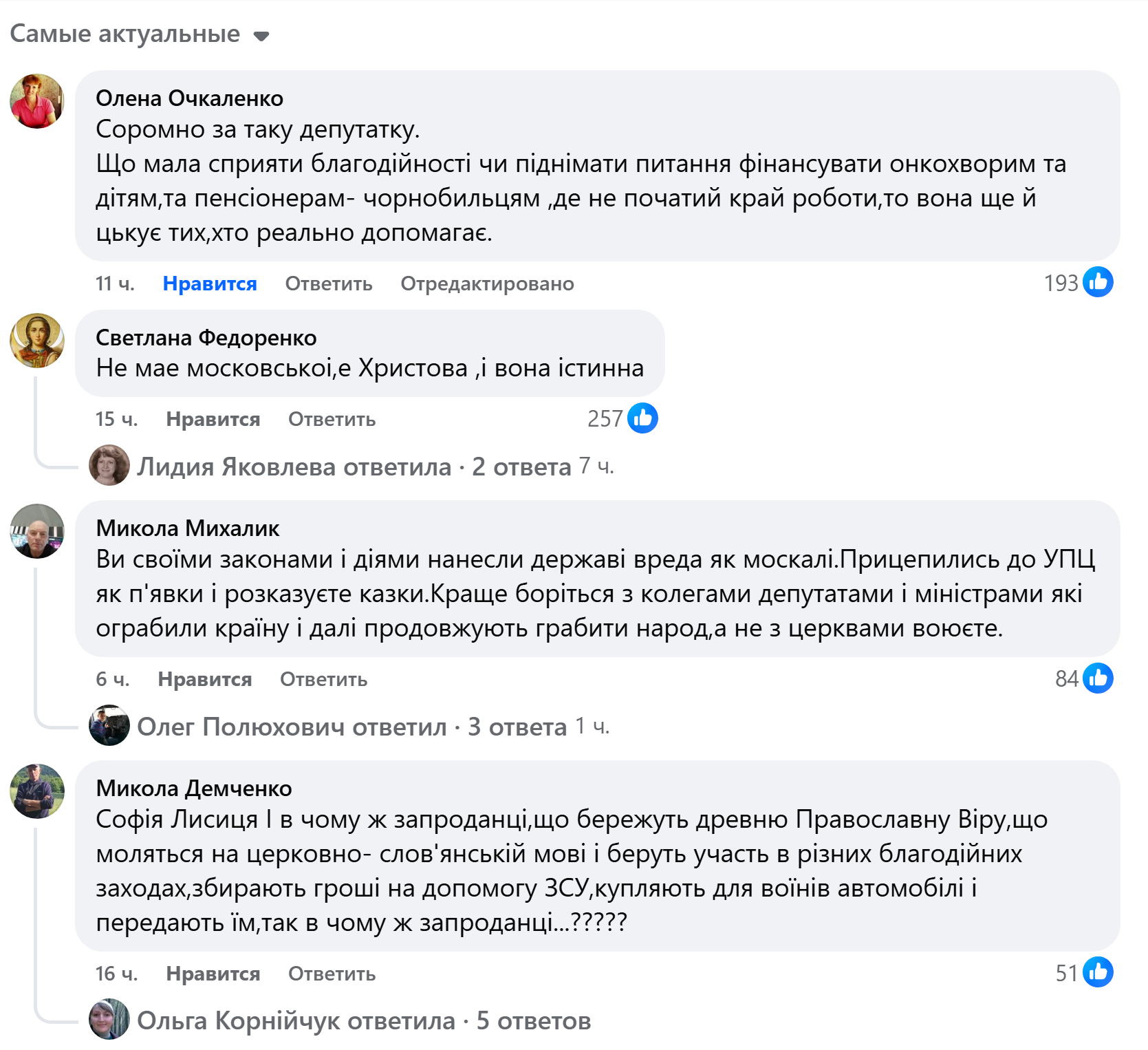 «Возможно, госпожа депутат хотела бы сама помочь больным деткам? Почему все, что исповедует УПЦ, воспринимается как российская пропаганда? Верующие УПЦ всеми силами – и молитвенными, и материальными, и физическими – приближают нашу победу. Возможно, не так массово афишируют и пиарятся на таких событиях, но делают это от всей души и с верой в Бога. Хватит искать врагов там, где их нет», – пишет Людмила Мазур.