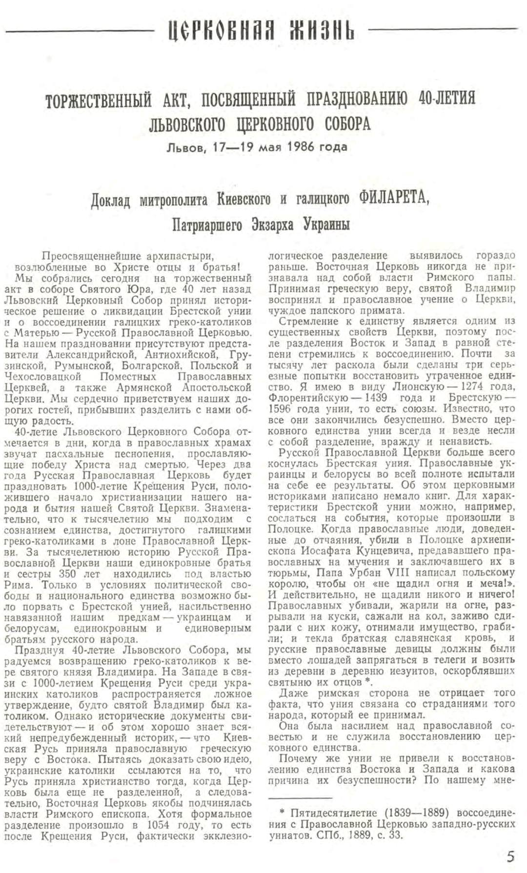 «Через два года Русская Православная Церковь будет праздновать 1000-летие Крещения Руси, положившего начало христианизации нашего народа и бытия нашей Святой Церкви. Знаменательно, что к тысячелетию мы подходим с сознанием единства, достигнутого галицкими греко-католиками в лоне Православной Церкви. За тысячелетнюю историю Русской Православной Церкви наши единокровные братья и сестры 350 лет находились под властью Рима. Только в условиях политической свободы и национального единства возможно было порвать с Брестской унией, насильственно навязанной нашим предкам – украинцам и белорусам, единокровным и единоверным братьям русского народа», говорится в докладе Филарета 20 лет назад.