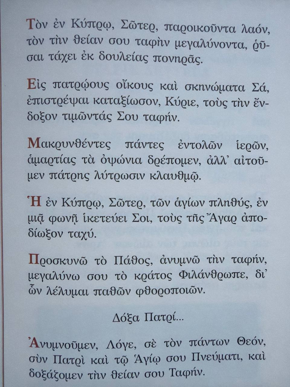 В конце первой статии содержатся прошения «избавить скоро от рабства лукавого» народ, на Кипре пребывающий, возвратиться в отеческие дома и жилища «тех, кто чтит славное Твое погребение», а также скоро изгнать «потомков Агари» (то есть турок).