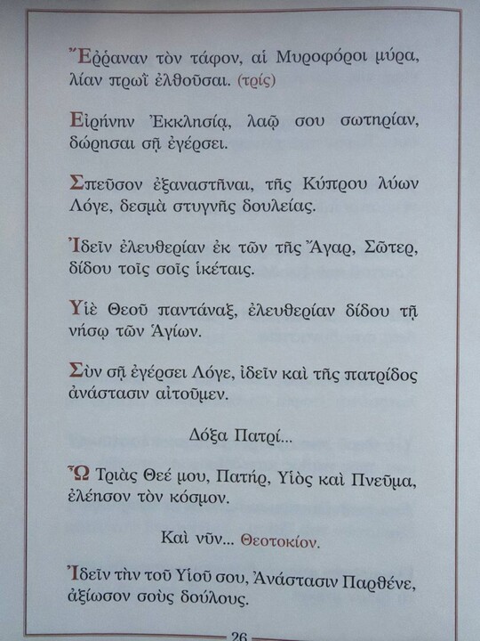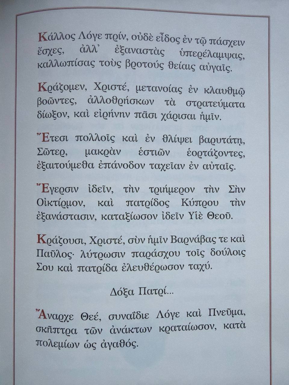 В тропарях второй статии есть просьба «увидеть отечества Кипра воскресение» так же, как «восстание тридневное Твое».