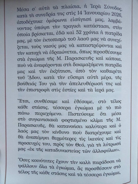 Синод Кипрской Православной Церкви утвердил включение новых энкомиев (похвальных тропарей) в Непорочны утрени Великой Субботы. Решение было принято на заседании 14 января 2026 года по предложению архиепископа Георгия.