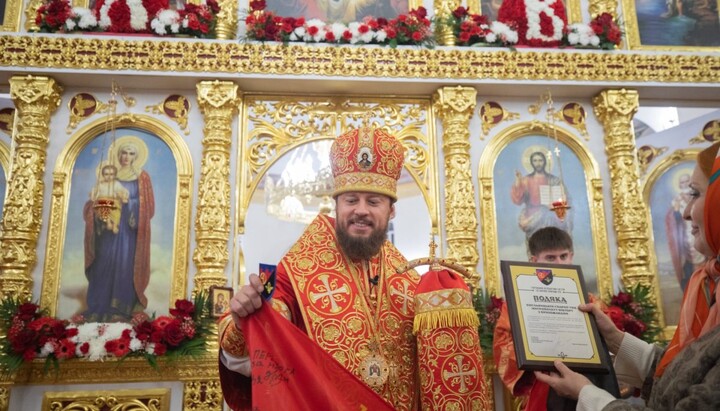 Сразу после ночного пасхального богослужения представители благотворительной волонтерской организации «С нами Бог» вручили митрополиту Хмельницкому и Староконстантиновскому Виктору почетную грамоту и боевой флаг 1-го батальона беспилотных систем.