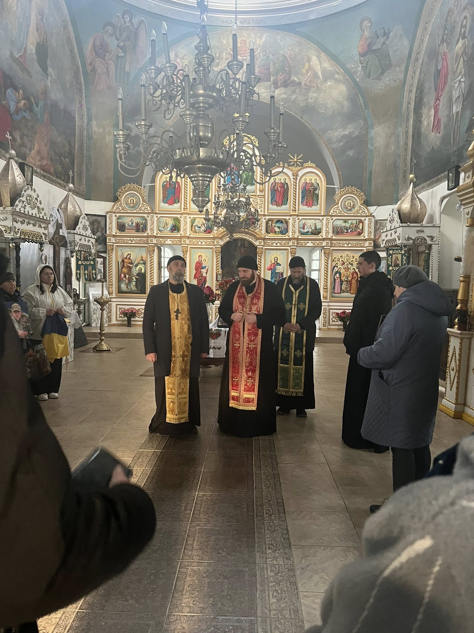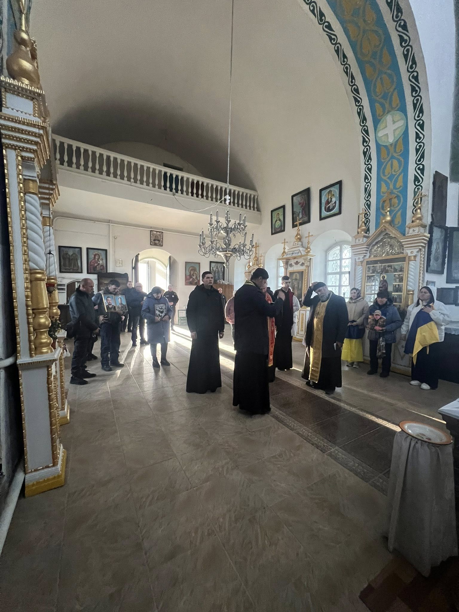 На фотографиях с молебна видно, что в храме, помимо клириков ПЦУ, находились около15 человек. Женщины – в брюках, некоторые без нательных крестов. В руках у молитвенников – государственные флаги, а также портреты неизвестных людей в военной форме, возможно – воинов ВСУ. По уверениям Мазур, собрать всех желающих не удалось из-за воздушной тревоги. Зачем было проводить мероприятие во время тревоги, она не уточнила.