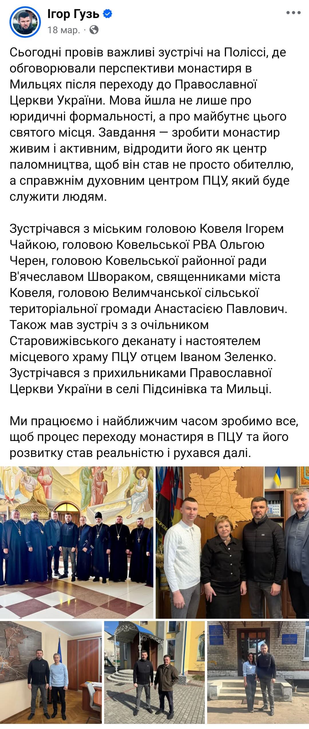 Говоря конкретно про Свято-Никольский Милецкий мужской монастырь, который в течение 30 лет возрождался монахами УПЦ и договор аренды с которым закончился 1 января (чиновники не решаются его продолжить), Гузь призвал депутатов не затягивать вопрос с переводом этого монастыря в ПЦУ. Как утверждает нардеп, когда монахи УПЦ будут выселены и монастырь будет передан ПЦУ, он станет "колыбелью украинского православия на Полесье", "центром паломничества", "духовным центром ПЦУ".