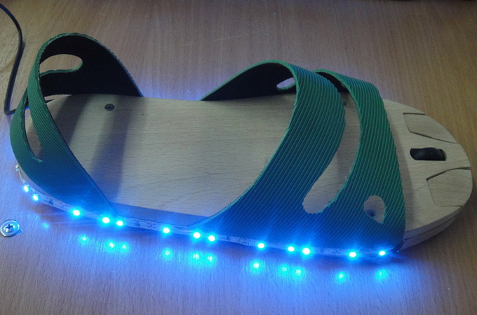 У підсумку підошва була зроблена з коркового бука. «Потім ми паяли світлодіодну стрічку – адже у хлопця, для якого ми лагодили пристрій, проблеми із зором. Треба було, щоб він легко міг знайти "мишу" навіть у темряві, а сама миша працювала б як нічник», – розповіла вчителька. Верх виконаний з матеріалу Habasit-12e.
