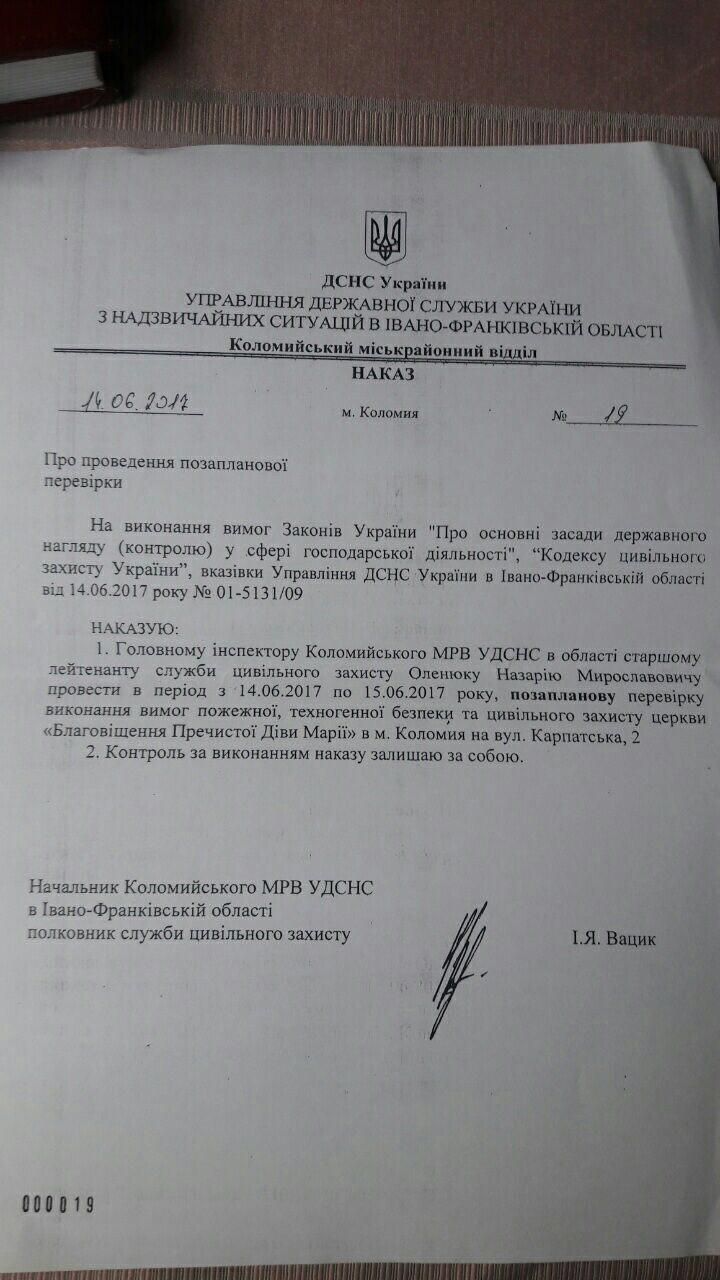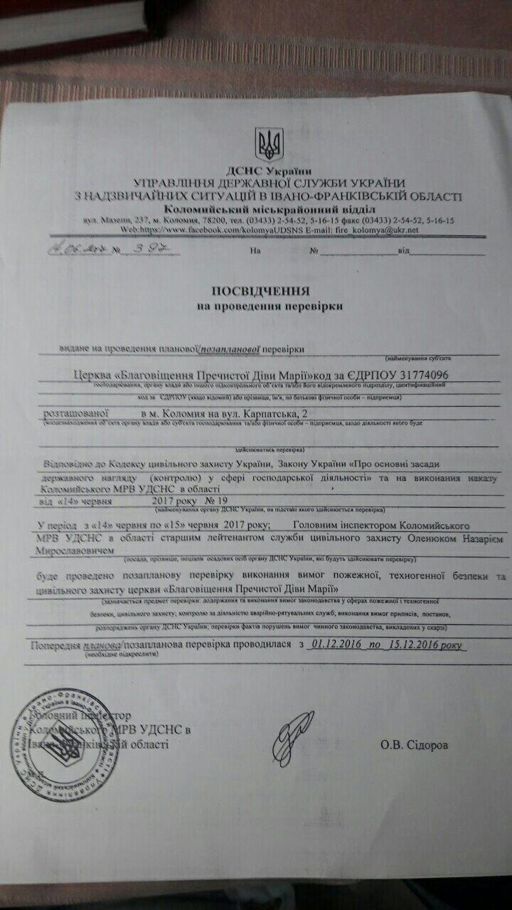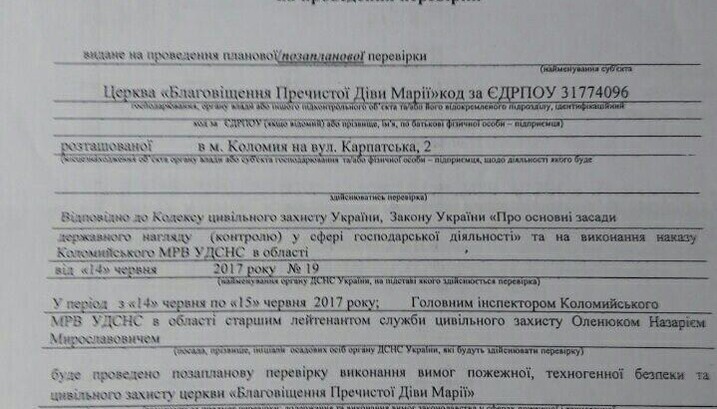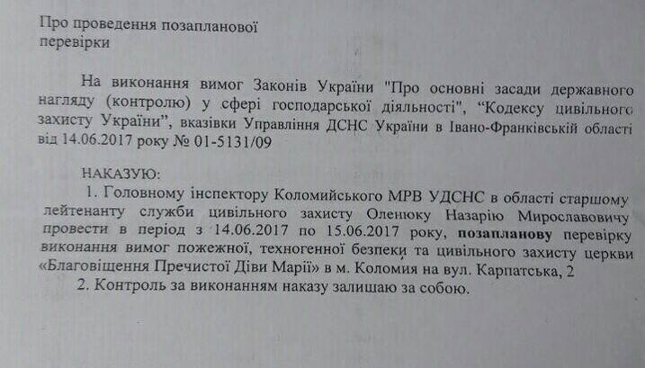 Позапланову перевірку з 14 по 15 червня буде проводити старший лейтенант служби цивільного захисту Назарій Оленюк. Він повинен проконтролювати «Виконання вимог пожежної, техногенної безпеки та цивільного захисту храму на честь Благовіщення Пресвятої Богородиці в місті Коломия».