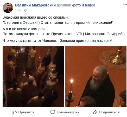 «Знайома прислала відео зі словами: "Сьогодні у Феофанії) Стоїть і молиться як простий прихожанин!" А я й не зрозумів, про кого йдеться. Потім скинули фото... а це Предстоятель УПЦ Митрополит Онуфрій! Що можу сказати... ця Людина – великий приклад для нас усіх!» – коментує учасник православної молодіжки.