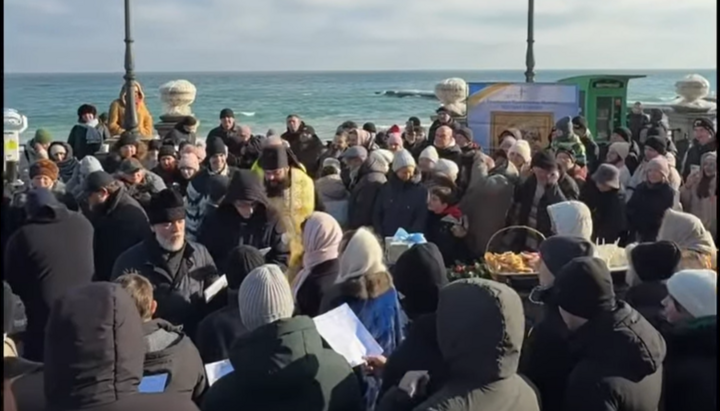 Священнослужителі Одеської єпархії освячують води Чорного моря. Фото: Скріншот відео прес-служби єпархії Священнослужителі Одеської єпархії освячують води Чорного моря. Фото: Скріншот відео прес-служби єпархії