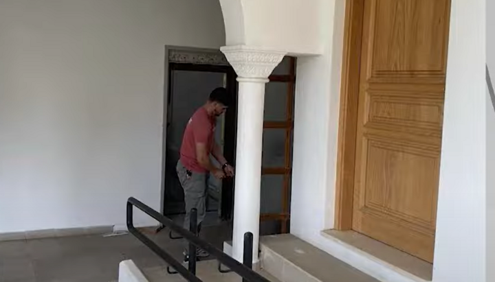 Слюсар міняє замки на входах до єпархіального управління Пафоса. Фото: Omega Слюсар міняє замки на входах до єпархіального управління Пафоса. Фото: Omega