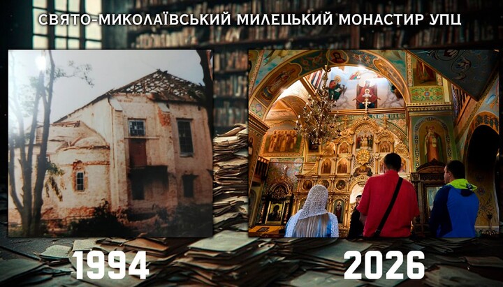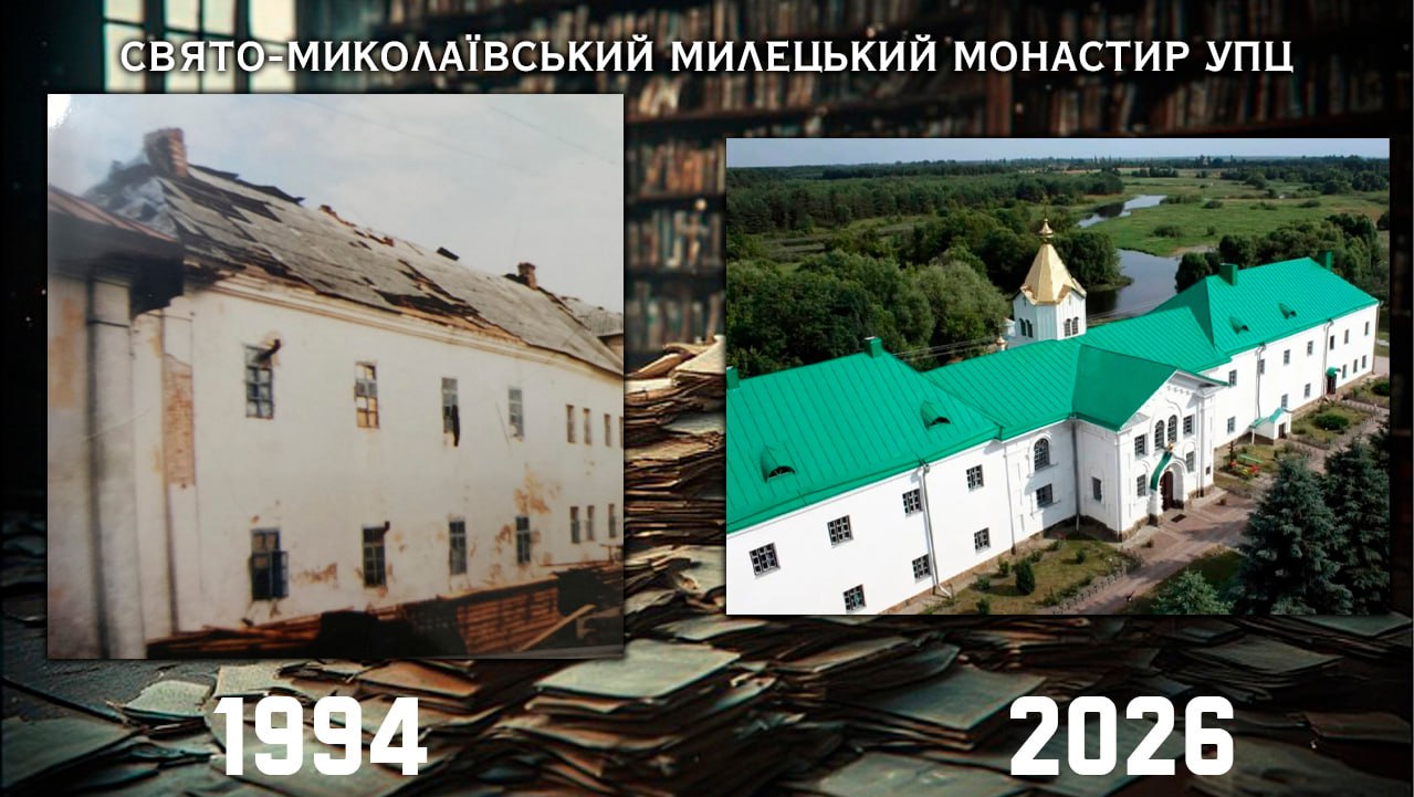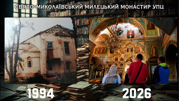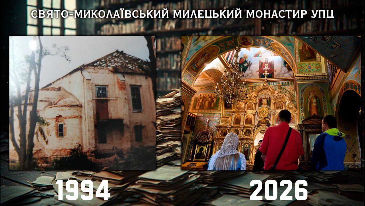 У Миколаївському Мілецькому монастирі УПЦ на Волині оприлюднили фото, зроблені одразу після повернення святині віруючим у 1994 році, а також сучасні знімки 2026 року. На фото видно контраст між зруйнованим станом обителі після десятиліть державного використання та її нинішнім виглядом.