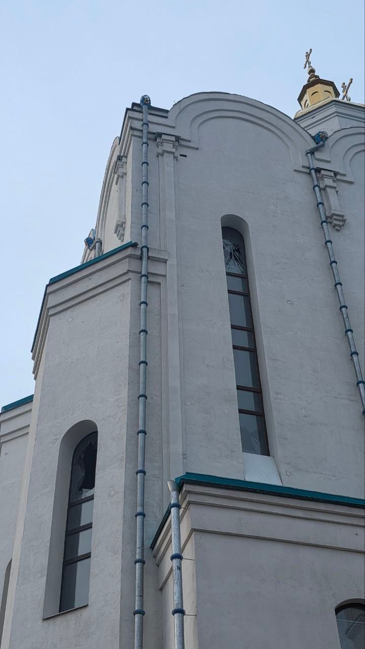 Судячи з кадрів з місця події, основне пошкодження припало на багатоповерховий корпус, розташований поряд із храмом. Вибухова хвиля вибила скло храму, в аркових вікнах верхнього поверху корпусу і в прямокутних прорізах на нижніх ярусах. Постраждали і масивні дерев'яні двері, прикрашені різьбленими хрестами.