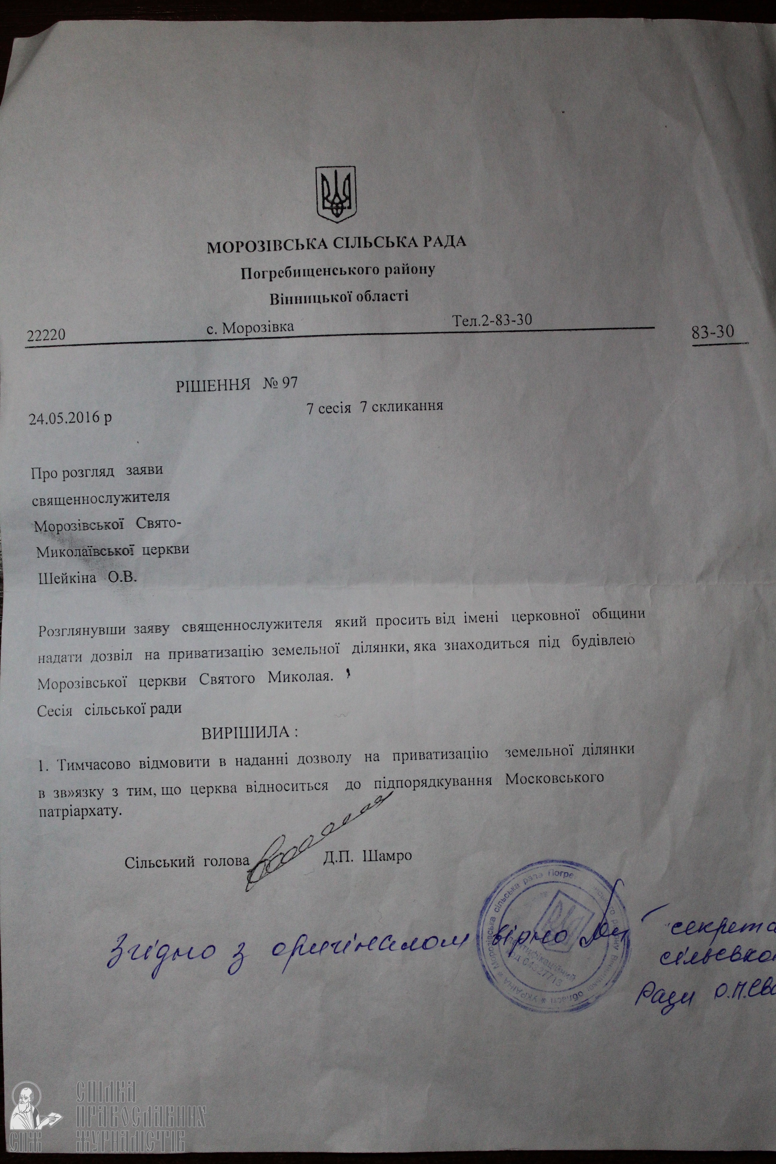 According to the UOJ source, Morozovka village council postponed for a long time an issue of address of the UOC religious community to obtain permission for privatization of the land plot, where Saint Nicholas temple is located. The priest was compelled to ask for a written notification to make sure the village council had received the community’s address. After a regular session of the council the priest was sent a decision “to temporarily refuse to grant permission for privatization of the land plot due to the fact the church is in the jurisdiction of the Moscow Patriarchate.”
