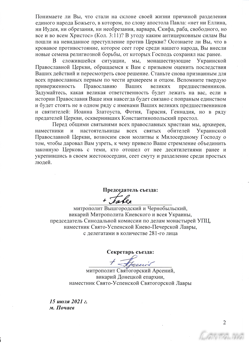 Your Holiness, on July 15, 2021, 310 participants of the monastic congress from 258 monasteries and 56 sketes, households and communities of the Ukrainian Orthodox Church gathered at the great Holy Dormition Pochaiv Lavra in order not only to discuss the pressing issues of monastic life but also to respond to those processes in world Orthodoxy, which undermine the unity of the Orthodox Church. We, monastics of the Ukrainian Orthodox Church, have always treated the spiritual tradition of the great Greek monasteries with respect and reverence. For us, both Holy Mount Athos and other monasteries in Greece have been places of receiving spiritual guidance and care. This phenomenon is traditional for the monastic tradition of our Church. Almost every monastery in Ukraine has icons painted on Mount Athos and Greece-related shrines. We treated the Greek monks, from whom we received spiritual instruction in simplicity, with love and reverence. We remember your visits to Ukraine, as well as your representatives’, when you illustrated in every possible way your support for the legitimate Metropolitan of Kyiv, first to His Beatitude Metropolitan Vladimir (Sabodan), and then to his successor, Metropolitan Onuphty of Kyiv and All Ukraine. Therefore, for us the greatest pain and the greatest sorrow were those treacherous actions that you, as a first among equal bishops of the Orthodox world, made towards the canonical Ukrainian Orthodox Church. We are at a loss as to what motivated your decisions, but we see with our own eyes what they led to. With confusion in our hearts and sorrow, we, monastics of the Ukrainian Orthodox Church, ask you, Patriarch Bartholomew, how your morality accepts the level of turmoil that your decision brought to our country: the seizure of churches, the beating of ordinary believers, discrimination of our pastors and flock at the state level, calls for the extermination of our clergy? Do you understand that in your declining years, you became the reason for the division of the one people of God, in which, according to the words of the Apostle Paul: “Here there is no Gentile or Jew, circumcised or uncircumcised, barbarian, Scythian, slave or free, but Christ is all, and is in all” (Col. 3:11)? To please what anti-church forces, you committed an unprecedented crime against the Church? Do you realize that into the bloody confrontation that sows grief among our people, you brought new seeds of religious struggle, from which the Lord saved us earlier?