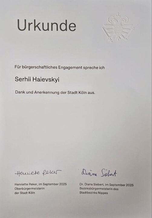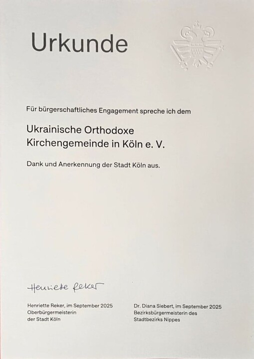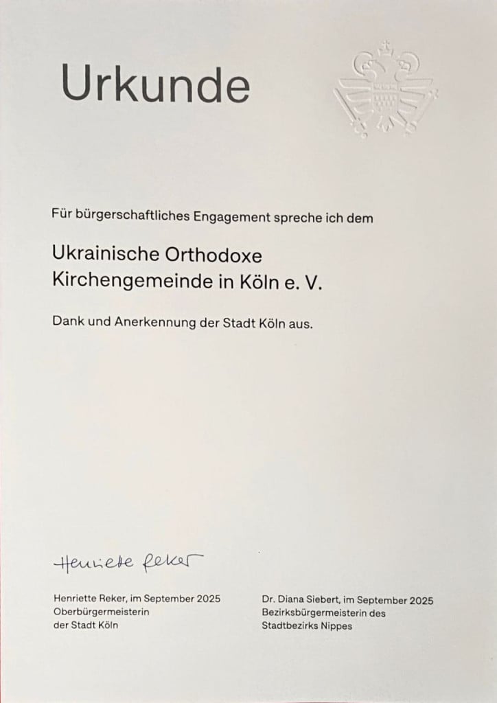 In September 2025, the mayor of Cologne, Germany, Henriette Reker, awarded a certificate of appreciation to the parish of the Ukrainian Orthodox Church of the Pochaiv Icon of the Most Holy Theotokos, reports the website of the UOC DECR.
