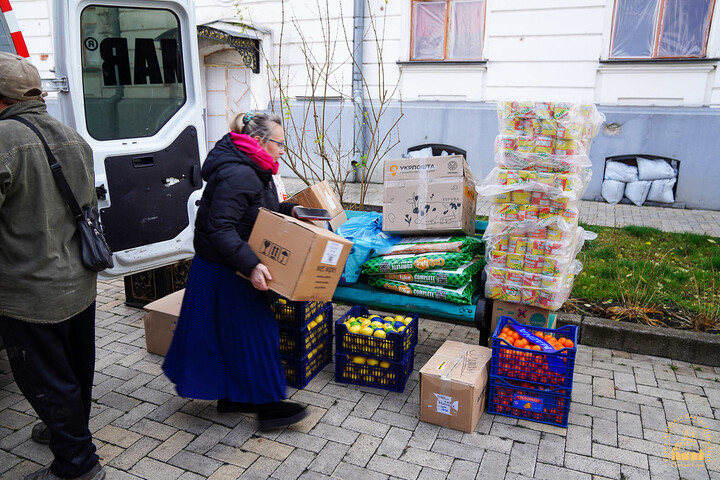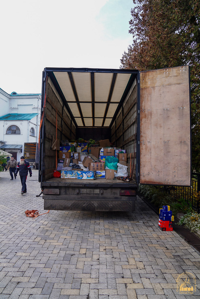 The cargo included 15 cubic meters of boards needed for repairing the damaged buildings of the Lavra, 2.5 tons of fruits (apples, pears, plums), more than 1 ton of sour cabbage, homemade preserves, flour, household chemicals, personal hygiene products, animal feed, shoes, and other essentials for the brethren and sisters of the All-Sorrowful Skete in the village of Bohorodychne.