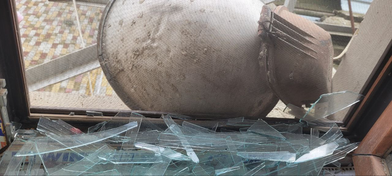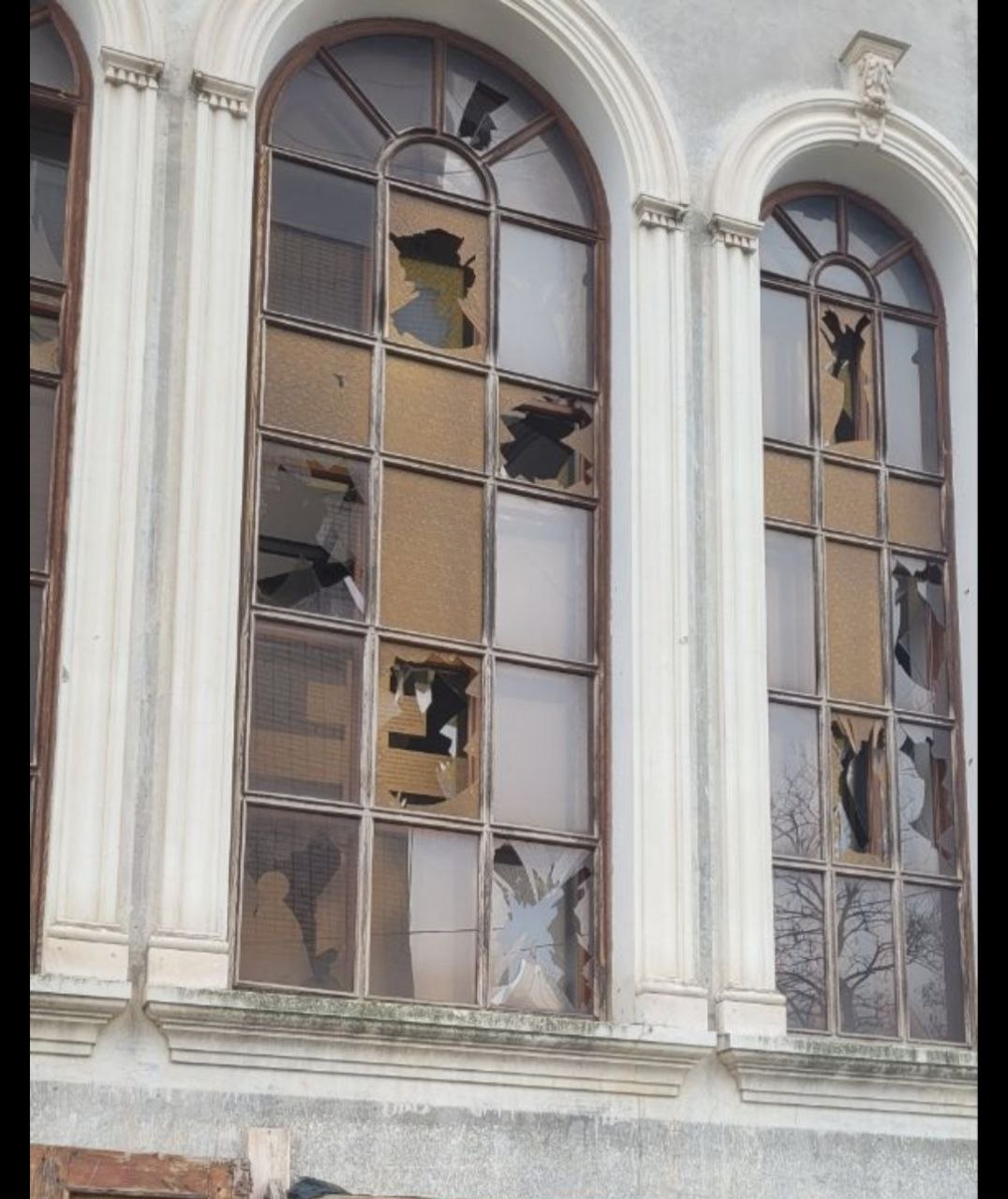 The church fence was destroyed, the windows were blown out, and the façade of the church as well as buildings on the church grounds were damaged.
