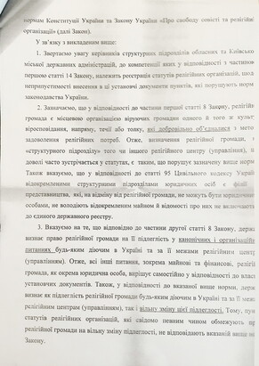 The text has been tailor-made exceptionally for statutes of the Ukrainian Orthodox Church. It is illustrated, in particular, by allusions to the norm-related provisions of the statutes being common solely for Orthodox confessions.The letter does not contain reservations on prohibition of ungrounded denial of registration. It is calibrated right to refuse to register statutes and amendments thereto. Herewith reasons for such denial are not directly stipulated by the laws of Ukraine.