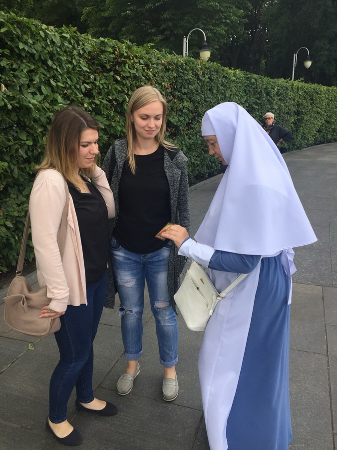 – Было такое радостное настроение, что хотелось простора: хотелось поделиться этой радостью – улыбаться, подарить, поздравить. И люди также радостно реагировали на нас, – рассказывает старшая сестра Марфо-Мариинской обители в Одессе Наталья Гербова. – Парк Славы нам очень понравился – там всегда много гуляющих и экскурсантов, и это совершенно разные люди. В Мариинском парке все время гуляют, примерно, одни и те же мамочки, и на Русановской набережной, в общем-то, постоянный состав. А в парк Славы приходят и экскурсии с детками, и школьники, и молодежь, поэтому мы охватываем большой, и именно молодой, контингент. Даже иностранцы там гуляют. В прошлый раз мы встретили китайцев с крестиками на груди – смогли как-то поговорить на английском, поулыбаться. Вспомнили, что в Киевское сестричество входит и специалист по китайскому языку, Таня Хоменко, жалко, что тогда ее не было с нами. А еще поняли, что и английский нам надо немного подучить. Как-то подошел к нам католик, сам попросил крестик и сразу же надел на себя.