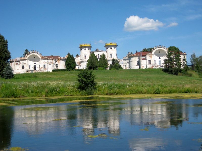 В отличие от церкви, дворец построен в стиле романтического классицизма с элементами готики – нечастый гость не только в Украине, но и в России. Как и церковь, дворец строился с 1782 по 1787 годы. Удивительно оригинальное, фантастически красивое здание, очень органично вписанное в окружающий ландшафт. Кто разработал проект дворца – точно не известно: считали, что это – то ли служивший в России архитектор Николя Легран, то ли Василий Іванович Баженов, а словарь Брокгауза и Ефрона и вовсе пишет про «живописный дворец, построенный архитектором Гваренги» [видимо, Джакомо Кварнеги]. Документально подтверждено, как и в случае с церковью, только участие в строительстве Максима Мосципанова и Дмитрия Котляревского.