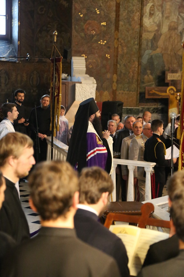 После прочтения молитвы над воспитанниками кадетского корпуса Преосвященнейший Варсонофий обратился к лицеистам, напомнив об ответственности, которая возлагается на каждого защитника Отечества, призвал к доблестному служению, указал на необходимость ценить заботу и внимание наставников. Владыка напомнил юным кадетам, что только общими усилиями можно достичь с Божьей помощью процветания, духовной крепости и мира в нашей стране. Под пение академического хора Лавры тропаря «Спаси, Боже, люди Твоя…» новобранцам были надеты погоны.