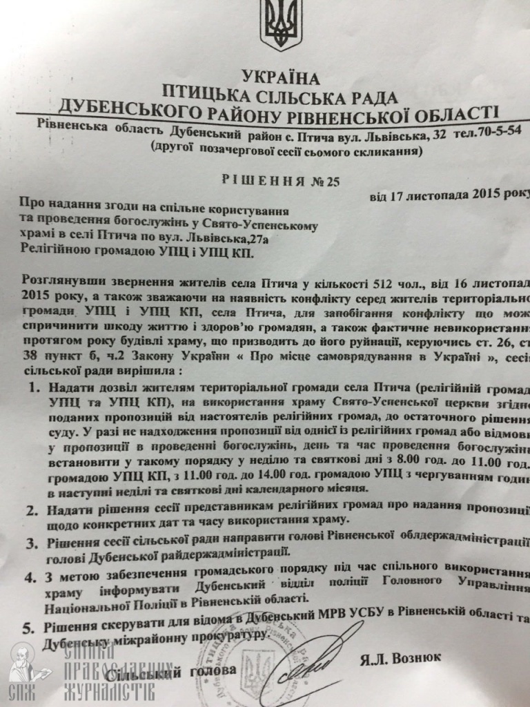 Сельсовет села Птичья Дубенского района Ровенской области, на внеочередной сессии, принял решение о введении поочередных богослужений в сельском храме, который является собственностью общины Украинской православной церкви. Об этом сообщает корреспондент Союза православных журналистов.