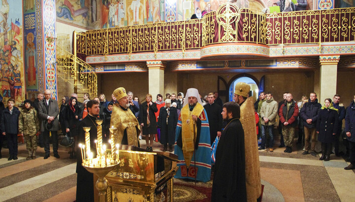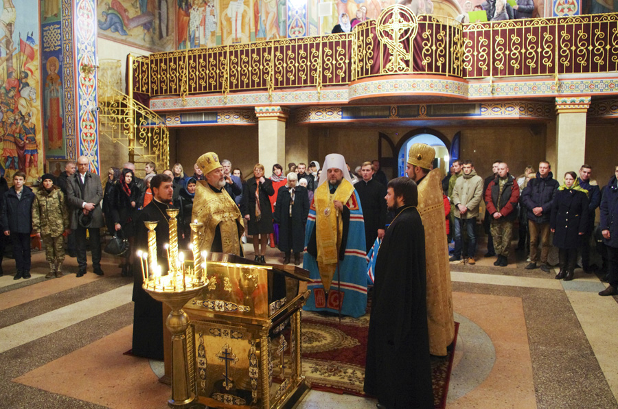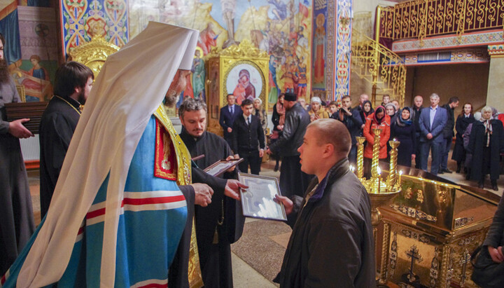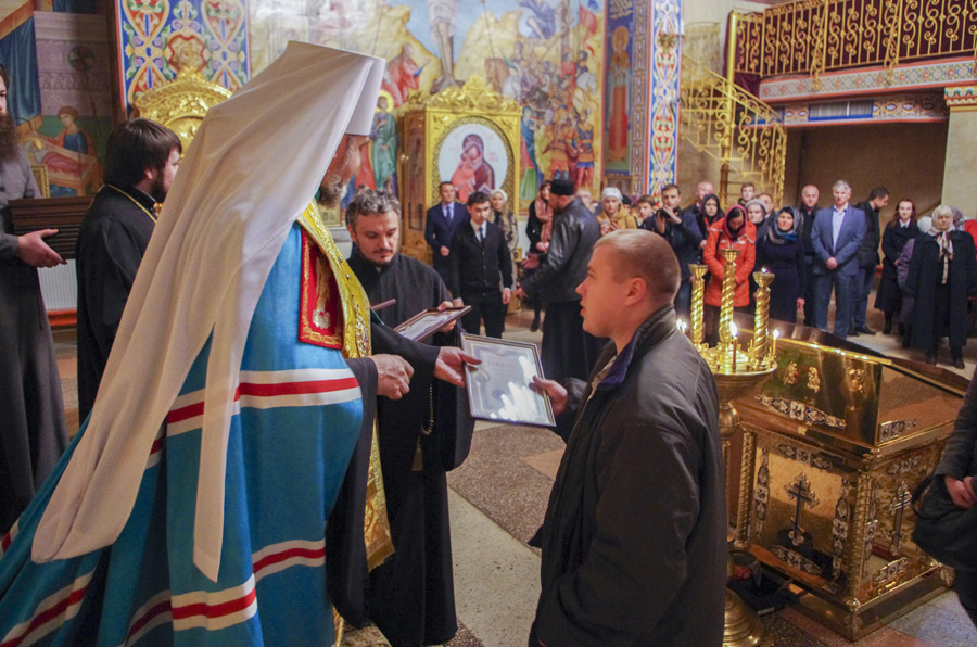 Перед врученням грамот митрополит Симеон звершив молебень за мир в Україні. Архіпастир подякував студентам, які у свої молоді роки щиро вболівають за майбутнє своєї країни і допомагають її захисникам. Митрополит Симеон нагадав слова святого апостола Іоанна Богослова: «Дiти мої! Будемо любити не словом чи язиком, а дiлом i правдою» (1 Ін. 3,18). Ці слова, як зауважив архіпастир, у повній мірі стосуються волонтерів, адже вони, виконуючи заповідь про любов до ближнього, жертвують для цього своїми силами, вільним часом, коштами, ризикують часто і власним життям, особливо тоді, коли надають допомогу у шпиталі на передовій.