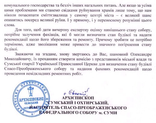 «Как я подчёркивал в своих предыдущих письмах, главный православный храм областного центра, Спасо-Преображенский кафедральный собор, на сегодня продолжает разрушаться. Трещины, которые выявили специалисты, постепенно приводят к нарушению целостности древнего сооружения в самом центре Сум, которое является памятником архитектуры», — выразил обеспокоенность владыка, обращаясь к сумскому голове Александру Лысенко.