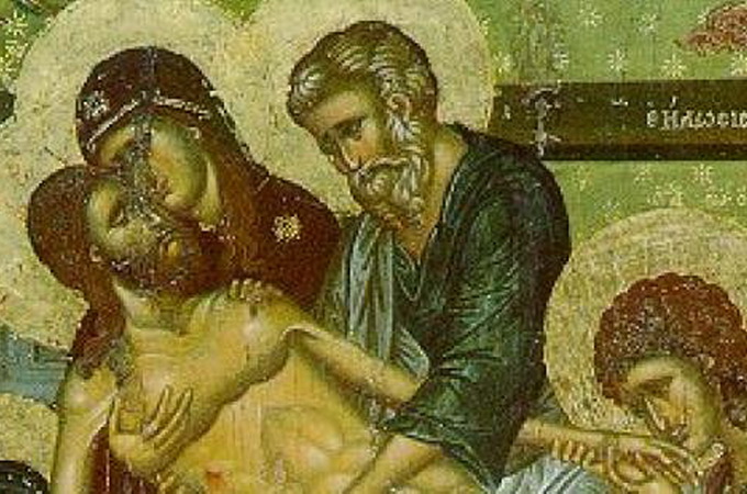 Они сняли с Креста Тело Спасителя, обернули плащаницей и положили в новом гробе, в котором никто ранее не был погребен: этот гроб святой Иосиф приготовил заранее для себя. Это произошло в саду Гефсиманском, в присутствии Богоматери и святых жен-мироносиц.