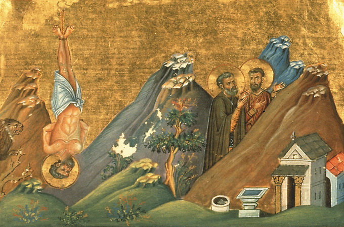 Святой мученик обратился с молитвой к Богу, и внезапно прибежал огромный лев. Все в страхе разбежались, а лев подошел к старцу и стал лапой поддерживать камень, привязанный к шее мученика.