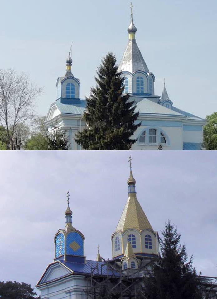 На фотоснимках, опубликованных краеведом, видно, как в храме «поработали» над куполом. Теперь он позолочен, как и купола главного культового сооружения УПЦ КП на Волыни – Свято-Троицкого кафедрального собора в Луцке. Однако если в областном центре эти «инновации» совершились еще в начале 2000-х, то до небольшого храма под Луцком у «реставраторов», видимо, руки дошли только сейчас.