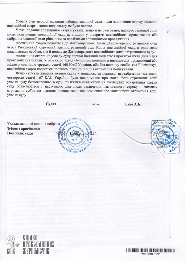 «Решением Ровенского окружного административного суда от 6 апреля 2016 года в удовлетворении иска относительно передачи церкви в поочередное пользование отказано, а Ровенскую ОГА обязали лишь предоставить УПЦ КП ответ на письма, которые стали основанием для обращения в суд. Внимание! Суд обязал лишь дать ответ. Вместо этого председатель Ровенской ОГА издал распоряжение», – прокомментировала правозащитник Ровенской епархии УПЦ Екатерина Иванюк.