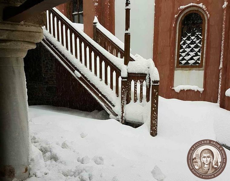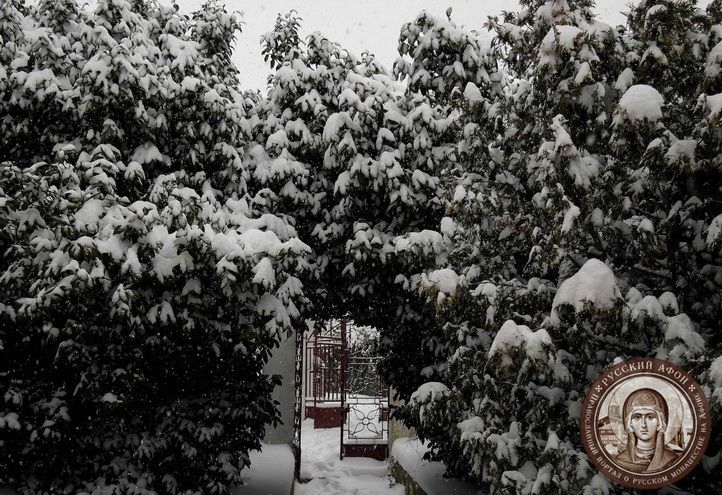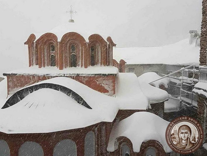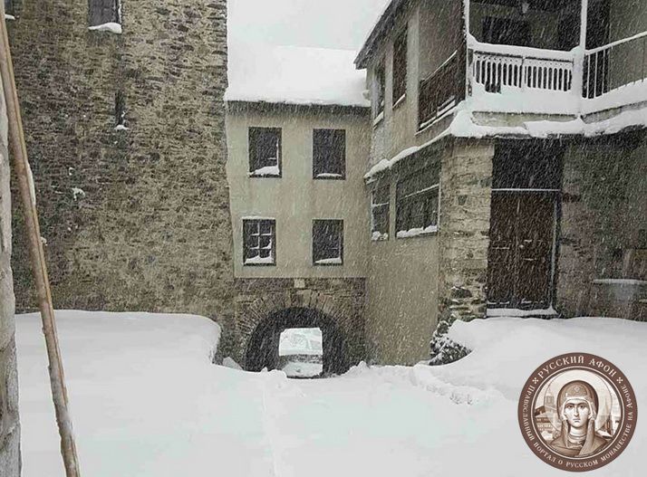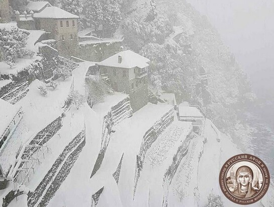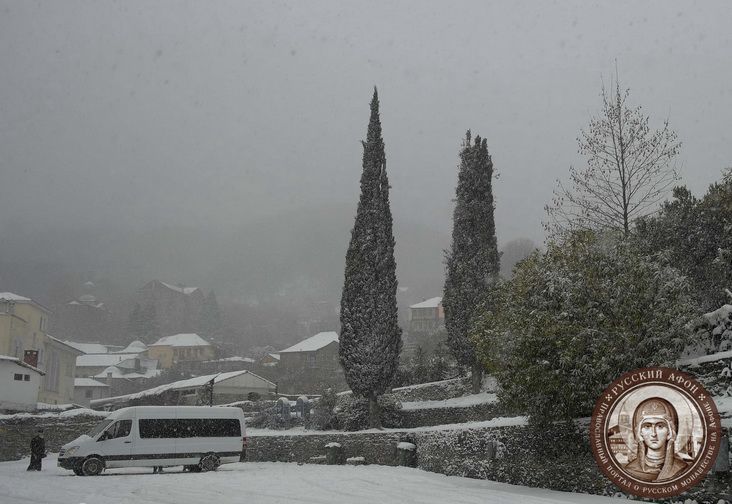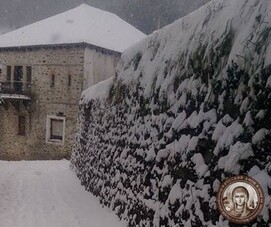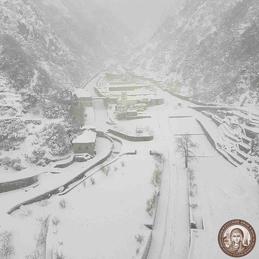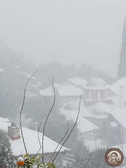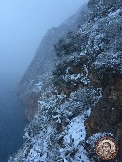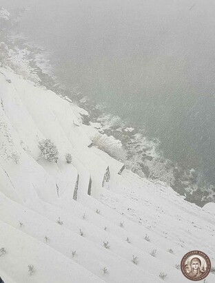 Святогорцы говорят, что за последние годы подобный сильный снегопад на Афоне наблюдается впервые. Снегом замело все горные тропы, так что ходить в горах сейчас невозможно и опасно для жизни. Замело и святогорские дороги, так что во многих местах передвижение по Афону серьезно осложнено.