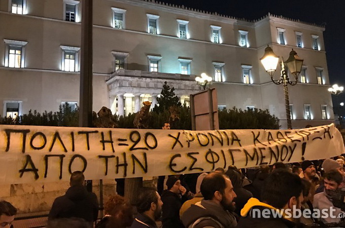 15 футбольных фанатов клуба АЕК из организации ORIGINAL 21 забрались на забор окружающий здание Парламента и вывесили баннер с надписью «Руки прочь от монастыря Эсфигмен».