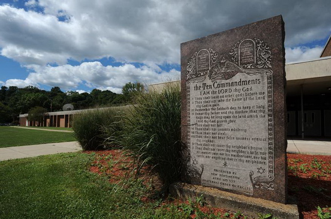 Памятник Десяти заповедям, высотой около двух метров, был подарен школе братством Ордена Орлов и установлен на лужайке за пределами школы в 1957 году. В 2012 году несколько местных жителей пожаловались на «прямой, регулярный и нежелательный контакт» с памятником Десяти заповедям. Их поддержал Фонд свободы от религии и подал иск от их имени. Однако в июле 2015 года окружной судья Терренс МакВерри (Пенсильвания, США) отклонил иск об удалении памятника Десяти заповедям.