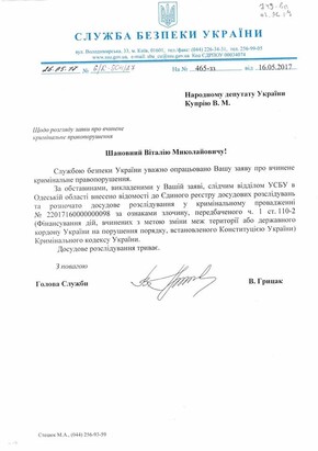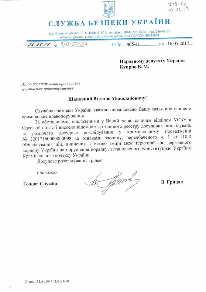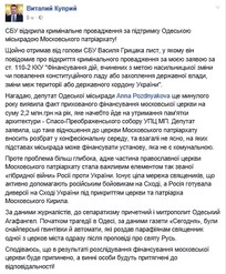 Только что получил от председателя СБУ Василия Грицака письмо, в котором он сообщил об открытии уголовного производства по моему заявлению по ст. 110-2 УК "Финансирование действий, совершенных с целью насильственного изменения или свержения конституционного строя или захвата государственной власти, изменения границ территории или государственной границы Украины"», – написал Куприй и призвал прекратить финансирование храма.