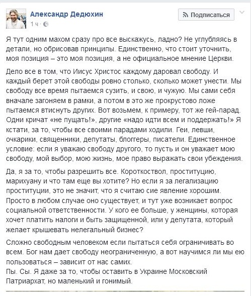«Да, я за то, чтобы разрешить все. Короткоствол, проституцию, марихуану и что там еще вы хотите?» – написал на своей странице в Facebook священнослужитель Киевского патриархата Александр Дедюхин.